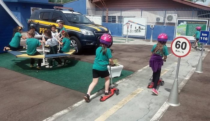 Após a exposição, eles foram colocar em prática os ensinamentos recebidos em uma pista simulada com placas de trânsito, faixas de pedestres e semáforo luminoso. Através de brincadeiras educativas, todos puderam se divertir e vivenciar, como pedestres ou condutores de patinetes, a responsabilidade individual no trânsito. Ao término, todos ganharam cadernetinhas de fiscalização e levaram para casa, onde ajudarão os pais a lembrarem dos cuidados aprendidos.