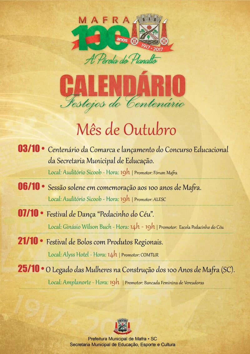 A Secretaria Municipal de Educação, Esporte e Cultura de Mafra divulgou o calendário de eventos do mês de outubro, com as atividades relativas ao centenário do município.