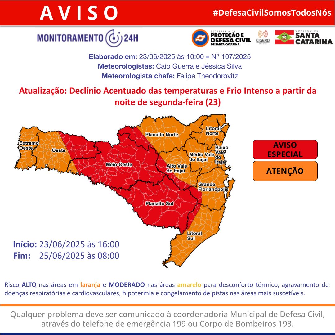 A Defesa Civil de Santa Catarina publicou um alerta para o declÃnio acentuado das temperaturas e frio intenso a partir da noite de segunda-feira (23).