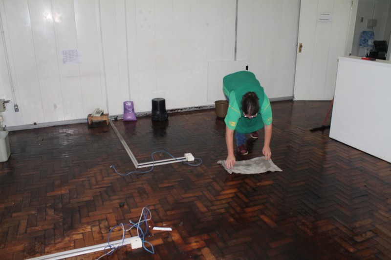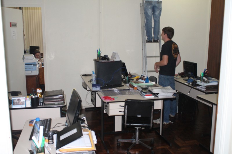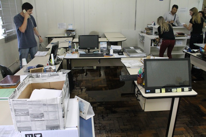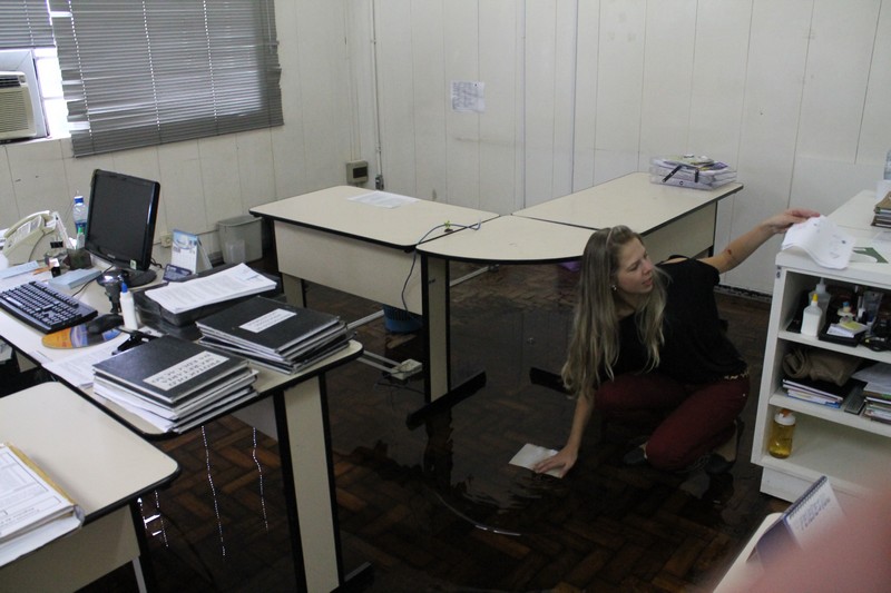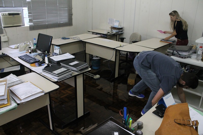 Os funcionários do departamento de licitações da Prefeitura de Mafra ficaram desalojados na manhã da última terça-feira (23) com a inundação de sua sala causada pela chuva que caiu durante a tarde e noite anteriores. Desolados, procuravam proteger os computadores e os documentos, carregando os equipamentos e prateleiras para o corredor da Prefeitura.