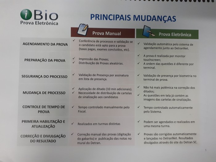 Para o delegado Rafaello Ross “A implantação da prova eletrônica é um grande avanço para a obtenção da Carteira Nacional de Habilitação. Além de mais moderna e segura, dará maior celeridade as etapas do processo, vez que o candidato tem acesso ao resultado da prova minutos após finalizá-la, acessando o site do Detran/SC. Antes, com a prova manual, o candidato esperava em média 48 horas para saber o resultado do exame de legislação”.