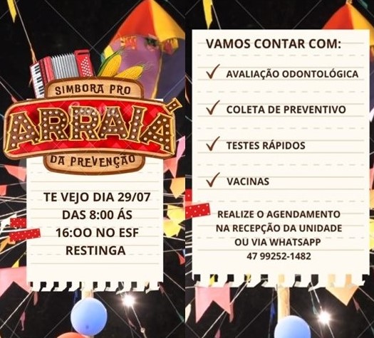 No Arraiá da Prevenção vai ser possÃvel fazer avaliação odontológica, coleta de preventivo, testes rápidos e ainda colocar as vacinas em dia. É importante fazer o agendamento de preventivo na recepção da unidade de saúde ou via whatsApp (47) 99252-1482.