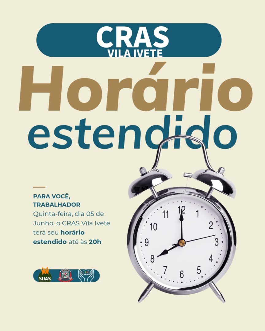 O Centro de Referência de Assistência Social – CRAS da Vila Ivete comunica que na próxima quinta-feira, dia 5 de junho, haverá horário de atendimento estendido, das 17 às 20 horas, para os trabalhadores que não conseguem se deslocar durante os turnos matutino ou vespertino, nos horários normais de atendimento. Nesse dia serão realizados todos os atendimentos normais do CRAS.