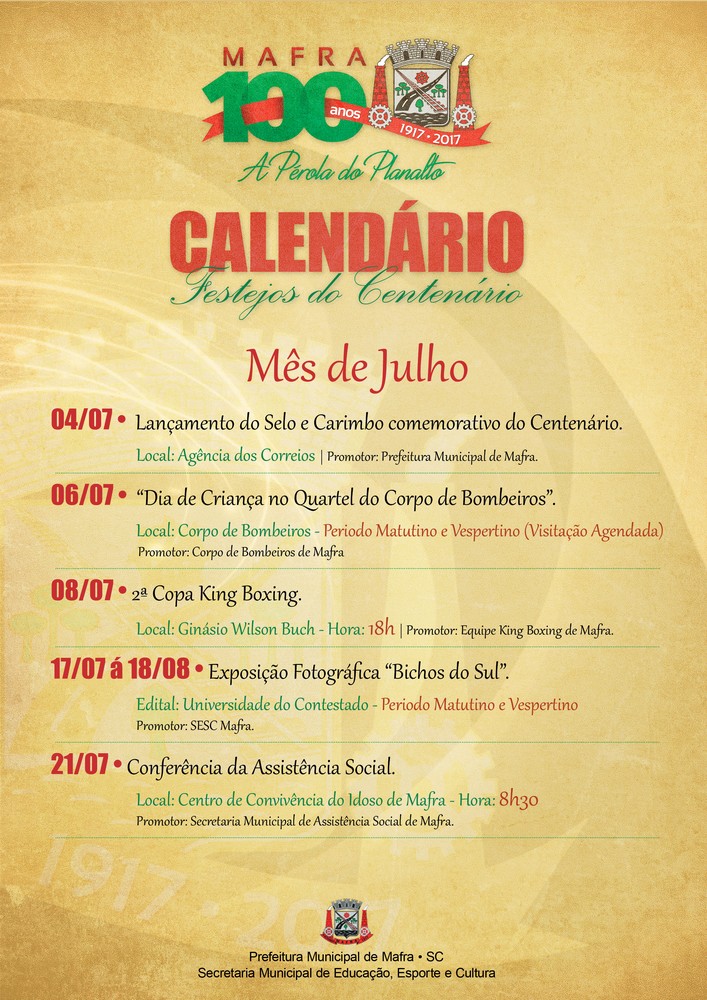 A Prefeitura de Mafra divulgou através da Secretaria Municipal de Educação, Esporte e Cultura, o calendário dos festejos do centenário do município com os eventos programados para o mês de julho deste ano.