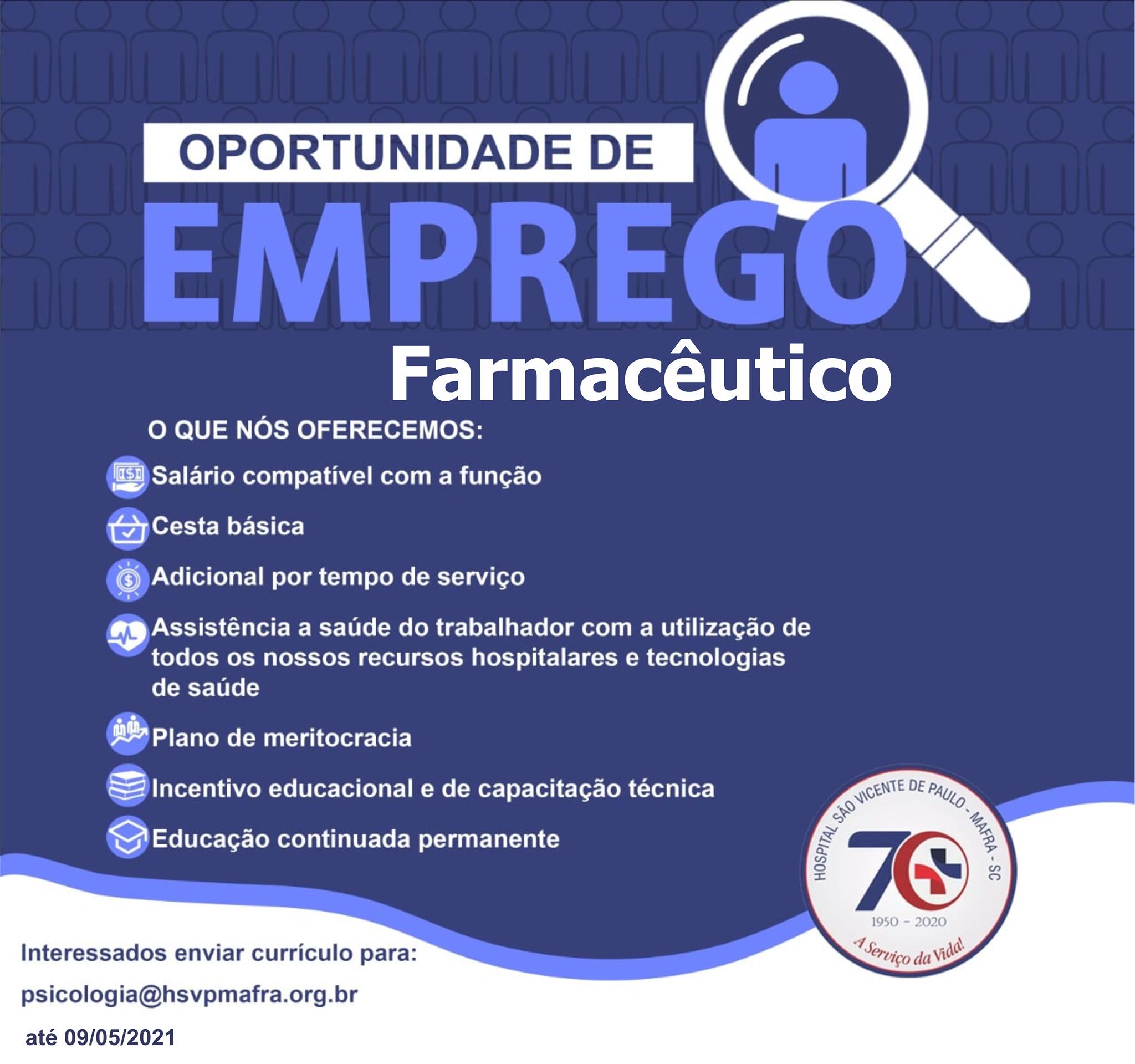 O Hospital São Vicente de Paulo de Mafra está com vaga de emprego disponÃvel para farmacêutico. Interessados podem enviar o currÃculo para o e-mail: psicologia@hsvpmafra.org.br