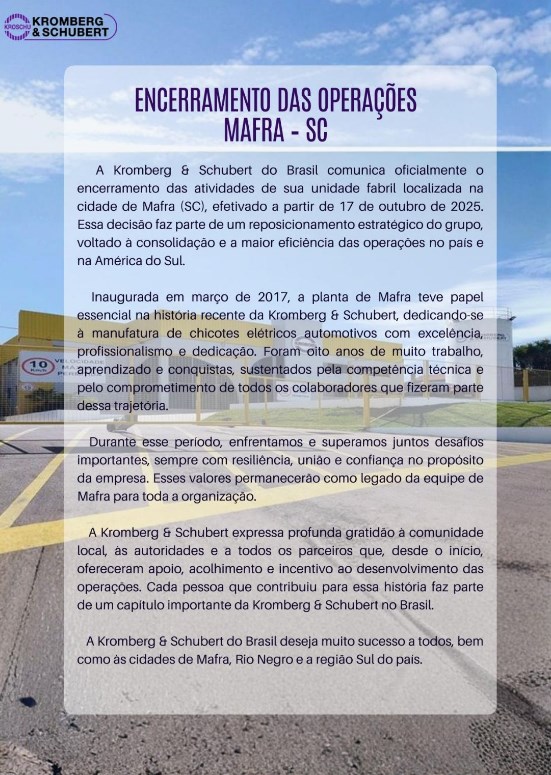 Empresa Kromberg & Schubert anuncia fim das atividades em Mafra