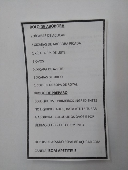 “A família interagindo com a escola”. Esse foi o resultado positivo de uma simples receita de bolo de abóbora feito para o lanche na EMEB Evaldo Steidel, na localidade de Saltinho do Canivete. O bolo fez parte do projeto de receita saudável, desenvolvido pela professora Ivanir, com a ajuda das crianças do Jardim I e II, dentro do planejamento de Educação Alimentar e Nutricional, que as escolas devem realizar anualmente.