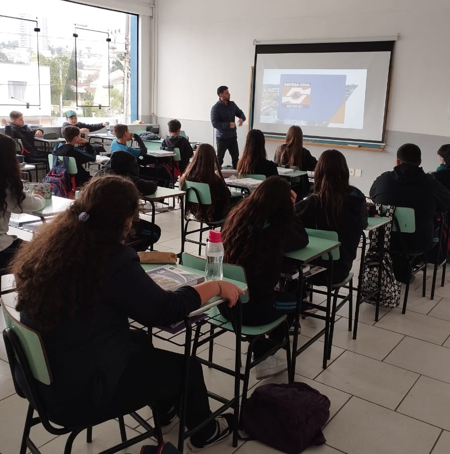O projeto “Defesa Civil nas escolas”, do Governo do Estado, está sendo levado a efeito pelas unidades municipais. Participou da palestra o diretor da Defesa Civil de Mafra, Juliano Hack Machado.