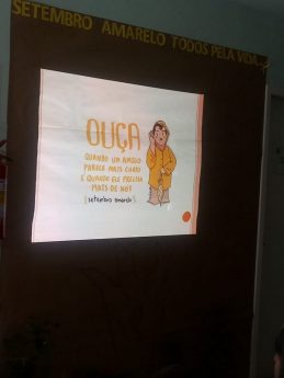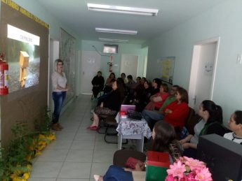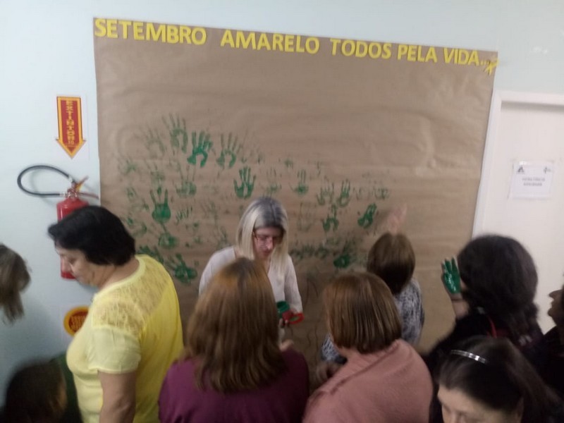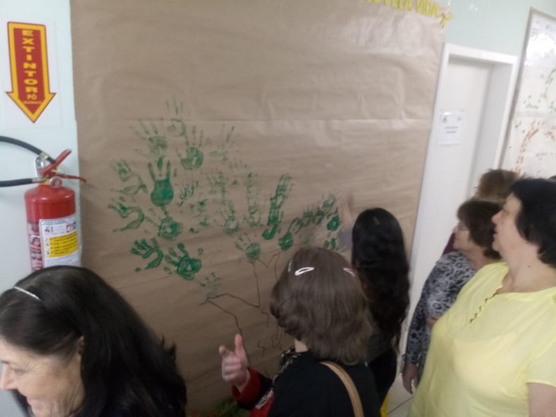 À tarde foi a vez dos participantes do grupo de ansiedade da ESF e demais membros da comunidade assistirem à peça que abordou o suicídio. Também houve palestra sobre depressão com a psicóloga Fabiane Bonin Graf do NASF. No final, cada pessoa recebeu uma muda de árvore, uma vez que houve um painel com desenho de árvore no qual cada participante escreveu seu problema – dinâmica para aliviar a ansiedade.