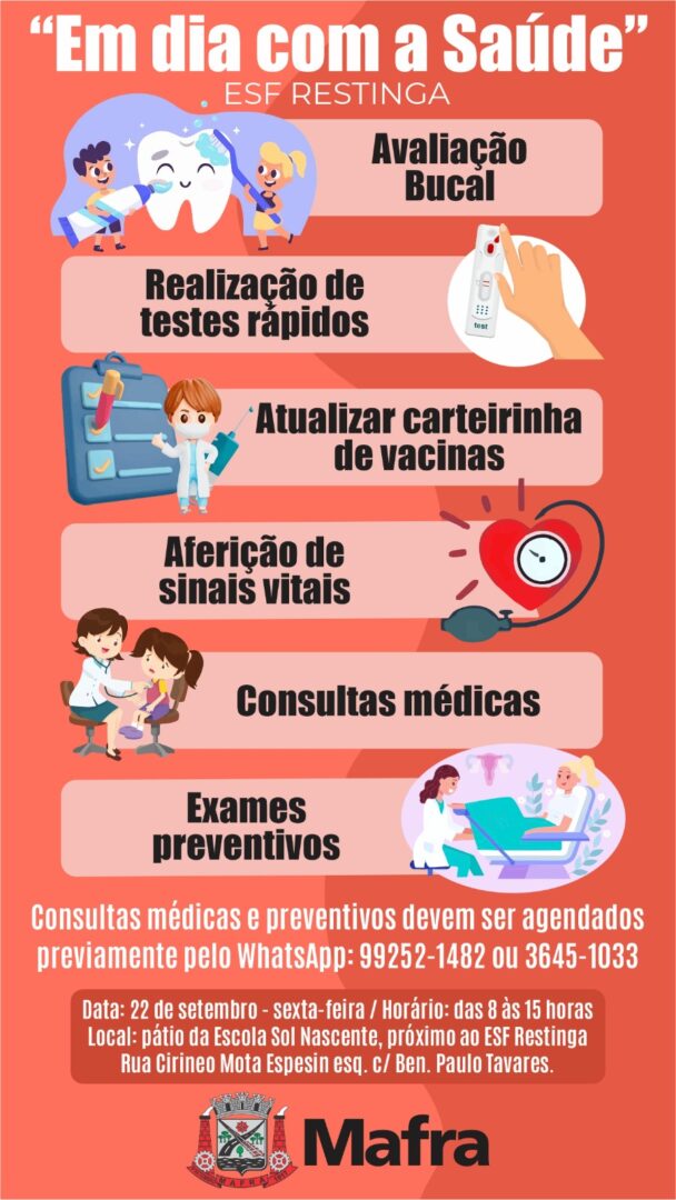 Os moradores do Imbuial que utilizam os serviços de saúde da ESF Restinga, vão poder aproveitar para avaliar o estado de saúde no evento “Em dia com a Saúde”. Ele será no pátio da Escola Sol Nascente, no dia 22, das 8 às 15 horas. Quem for ao local poderá realizar avaliação bucal, testes rápidos, atualizar a carteirinha de vacinas e aferição de sinais vitais.