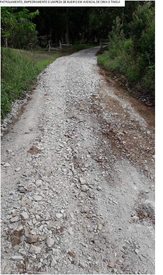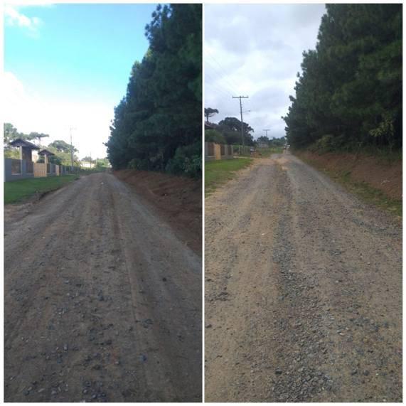 No perÃodo de 5 a 8 de abril realizou melhorias na localidade de Tacaniça, sentido Uvaraneira, em Vila Ruthes, Avencal de Cima, Tingui, Rio Preto do Sul, Bela Vista, Irara, no sentido Butiá dos Tabordas e Saltinho do Canivete.