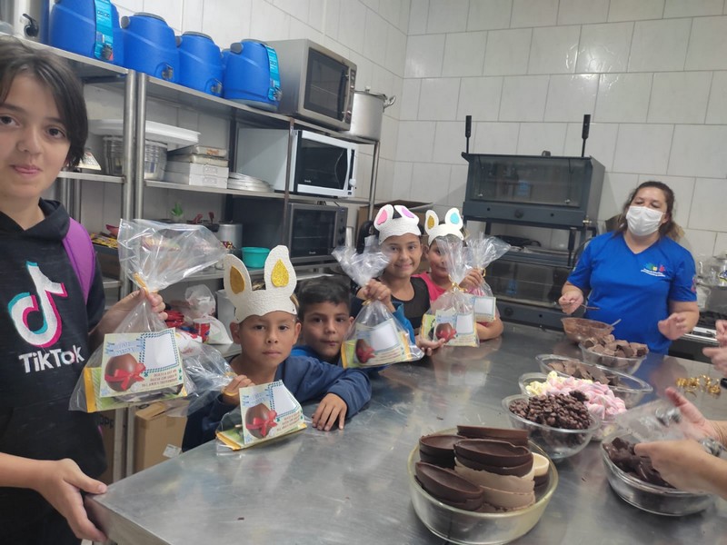 Na oficina do dia 8 de abril, às crianças e adolescentes puderam confeccionar seus ovos de Páscoa e ainda participaram de atividades de artesanato de Páscoa, pintura de rosto e brincadeiras como caça aos ovos.