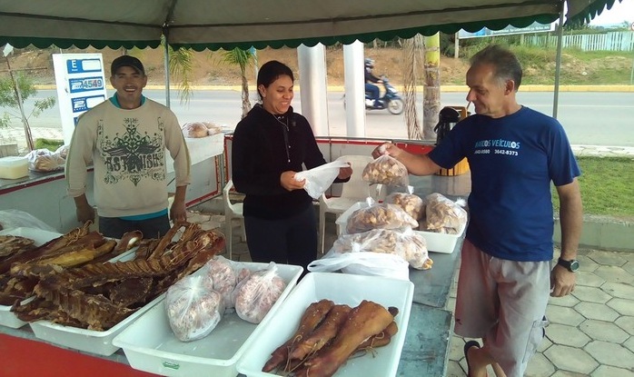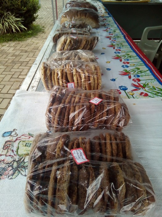 Ana Lúcia Righi e seu marido José Silveira de Alves, da Fazenda do Potreiro, trabalham com os demais membros de sua família na produção de defumados, linguiças, pães, queijos e verduras. Eles formam uma das famílias pioneiras na feira que há mais de oito anos atendem os consumidores. “No início do mês vendemos mais, mas não podemos reclamar. Sempre vendemos bem. As três famílias sobrevivem disso”, contou Ana Lúcia. Ela ainda lembrou que num dia chega a vender de 15 a 20 pães caseiros, além dos demais produtos ofertados. “Queremos aumentar nossa produção e estamos pensando em produzirmos também bolachas caseiras”.