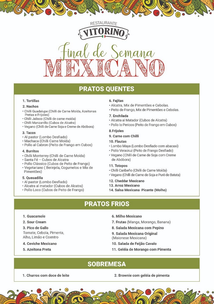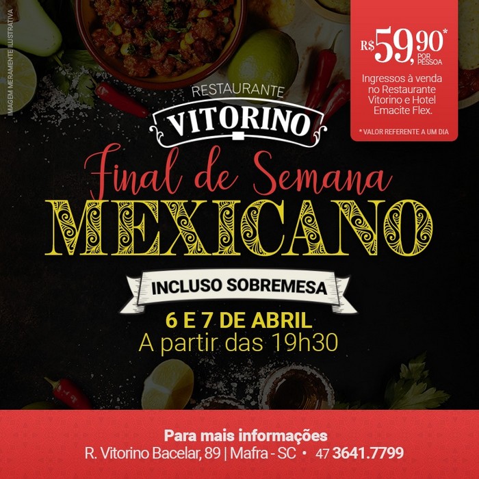 Prestigie o Final de Semana Mexicano no Restaurante Vitorino. Dias 06 e 07 de abril a partir das 19h30. Um cardápio especial espera por você! O restaurante fica localizado na Rua Vitorino Bacelar, nº 79, ao lado do Hotel Emacite.