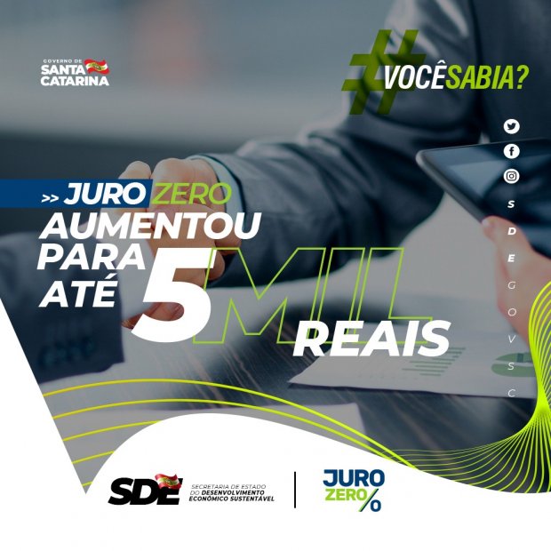O Governo de Santa Catarina ampliou um dos mais abrangentes programas para o microempreendedor individual (MEI) no Estado, o Juro Zero, durante a pandemia do novo coronavírus. O valor da linha de crédito passará de R$ 3 mil para R$ 5 mil por CNPJ. Esta medida faz parte do programa Reação SC, movimento que prevê ações de retomada após a crise.