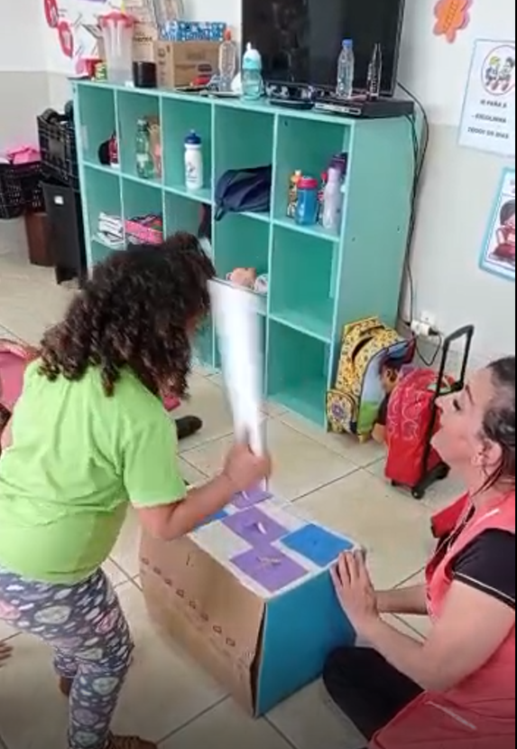 Utilizando a criatividade e uma caixa de papelão com furos, a professora colocou a figura do rato por baixo da caixa, através de um buraco. Quando o rato aparecia, o aluno, utilizando uma colher feita de papelão, tinha o desafio de acertar a casinha por onde o rato saía. (Vide fotos 1, 2 e 3). O objetivo desta atividade foi o de desenvolver a atenção, concentração, coordenação motora ampla e fina e interação com a turma. Dentre os valores trabalhados: afetividade, amizade e o respeito com os amigos. Este último aprendendo a esperar sua vez no jogo e torcer pelo êxito do colega. A professora relatou que “esta atividade foi extremamente divertida, pois os alunos demonstraram entusiasmo e grande expectativa ao esperar sua vez de brincar e acertar o ratinho, além de respeito com o próximo”.