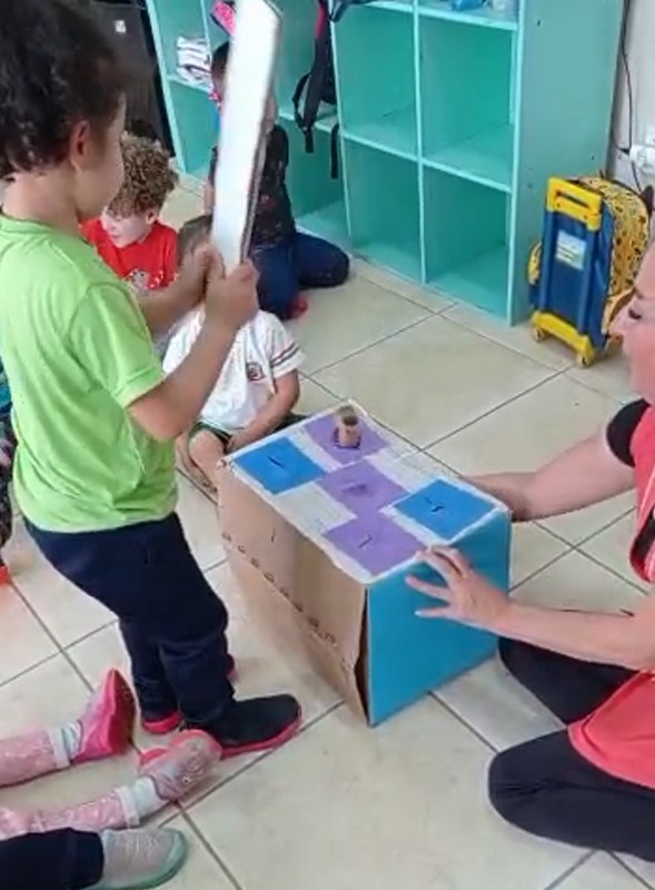 Utilizando a criatividade e uma caixa de papelão com furos, a professora colocou a figura do rato por baixo da caixa, através de um buraco. Quando o rato aparecia, o aluno, utilizando uma colher feita de papelão, tinha o desafio de acertar a casinha por onde o rato saía. (Vide fotos 1, 2 e 3). O objetivo desta atividade foi o de desenvolver a atenção, concentração, coordenação motora ampla e fina e interação com a turma. Dentre os valores trabalhados: afetividade, amizade e o respeito com os amigos. Este último aprendendo a esperar sua vez no jogo e torcer pelo êxito do colega. A professora relatou que “esta atividade foi extremamente divertida, pois os alunos demonstraram entusiasmo e grande expectativa ao esperar sua vez de brincar e acertar o ratinho, além de respeito com o próximo”.