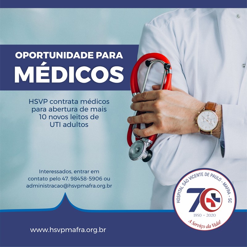 O Hospital São Vicente de Paulo, de Mafra-SC, está contratando médicos para a abertura de mais 10 novos leitos de UTI adultos.