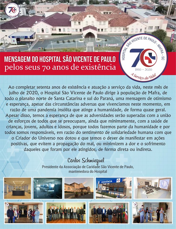 Abaixo uma mensagem do presidente da Associação de Caridade São Vicente de Paulo, mantenedora do Hospital, Carlos Schmieguel, em comemoração a esta data.