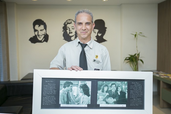 O gerente Fernando mostra com orgulho um dos quadros feito a mão há 10 anos (Foto: Renata Bosquetti)