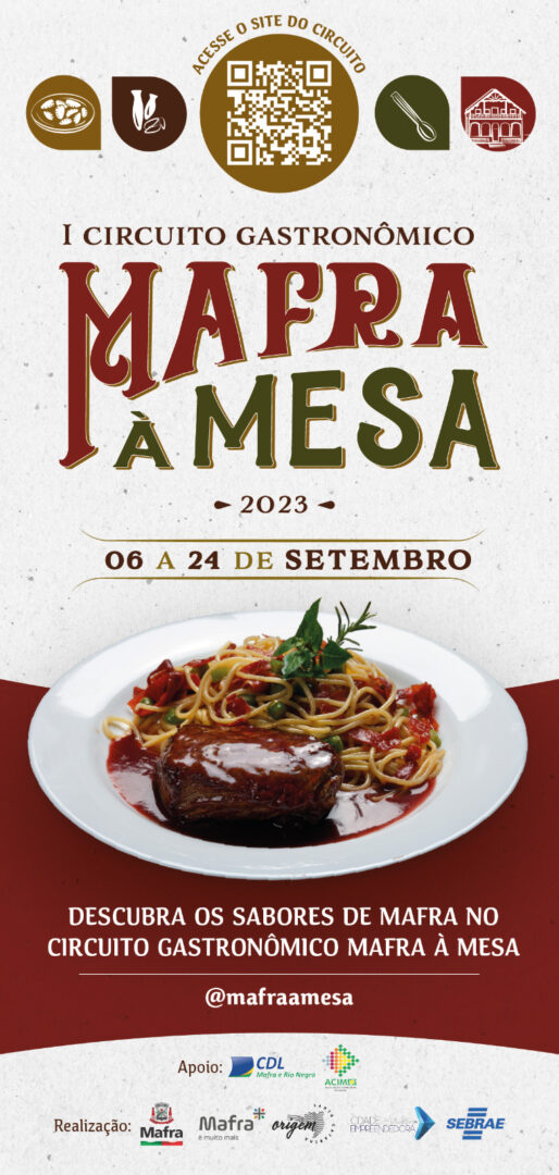 Como parte das festividades comemorativas aos 106 anos do Município, acontecerá no período de 6 a 24 de setembro, o I Circuito Gastronômico “Mafra à Mesa”. Serão 10 estabelecimentos participantes do circuito, os quais passaram por capacitação pelo SEBRAE, tendo como desafio criar um prato diferente do que já possuem em seus cardápios, utilizando ingredientes regionais.