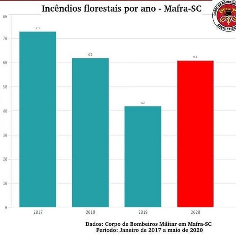 O primeiro semestre de 2020 ainda nem terminou e já temos um recorde no número de incêndios florestais na cidade de Mafra. Até o momento foram registrados mais incêndios que em todo ano de 2019. A estiagem, que neste ano chegou em março, normalmente era uma característica dos meses de agosto e setembro, trazendo como consequência a proliferação dos incêndios em vegetação.