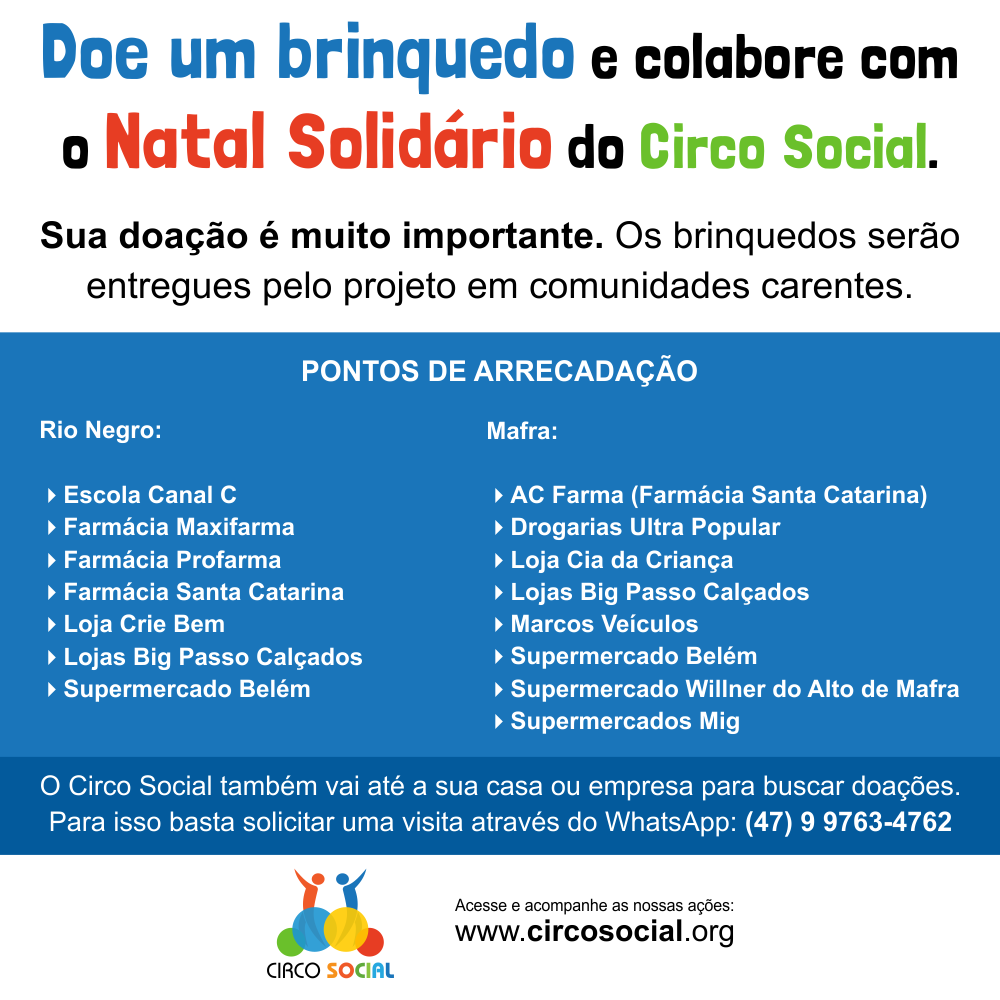 Nesta semana teve início a campanha Natal Solidário, realizada pelo projeto Circo Social. O objetivo é arrecadar brinquedos novos ou usados em bom estado para serem doados em comunidades carentes de Rio Negro e Mafra.