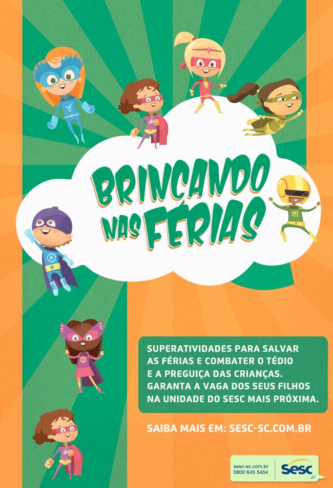 Durante o período de 22 a 26 de janeiro e 29 a 02 de fevereiro, das 13h30 às 17h30, o Sesc promoverá o Projeto Brincando nas Férias, que tem o objetivo de oferecer ao público infantil (03 a 10 anos), no período de recesso escolar de verão, uma opção qualificada de lazer, que contemple atividades de caráter lúdico educativo, destinadas a promover a diversão e a contribuir para o desenvolvimento de habilidades e conhecimentos.