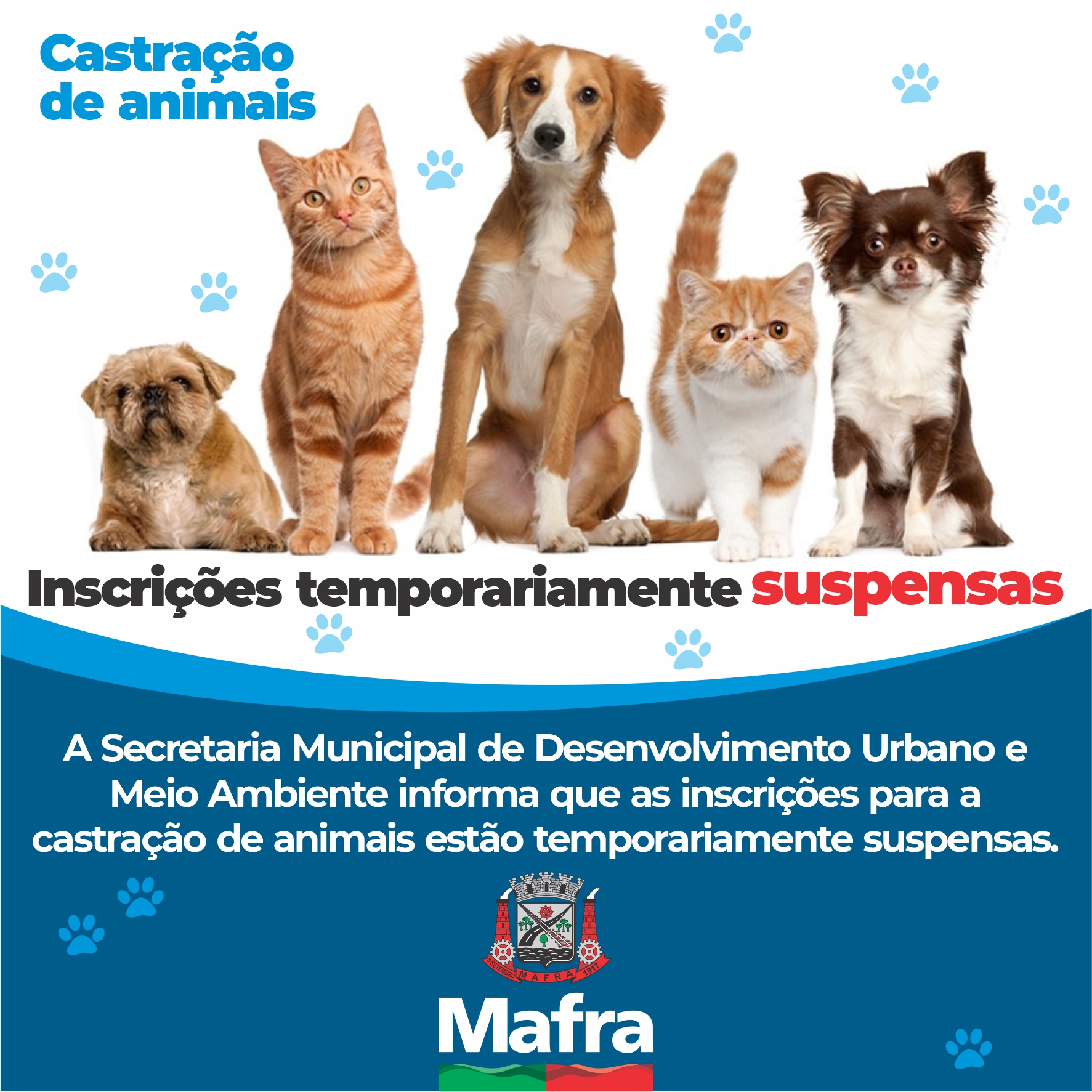 A Secretaria Municipal de Desenvolvimento Urbano e Meio Ambiente informa que as inscrições para a castração de animais estão temporariamente suspensas devido a reestruturação do Cadastro Único e sua equipe, a ser realizada pela Secretaria Municipal de Assistência Social e Habitação. Após a conclusão dos trabalhos, as inscrições serão retomadas e amplamente divulgadas.