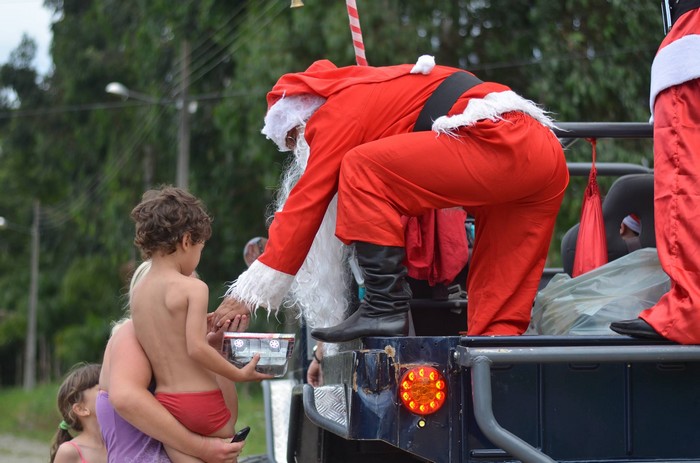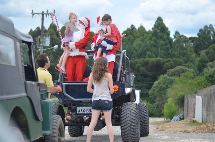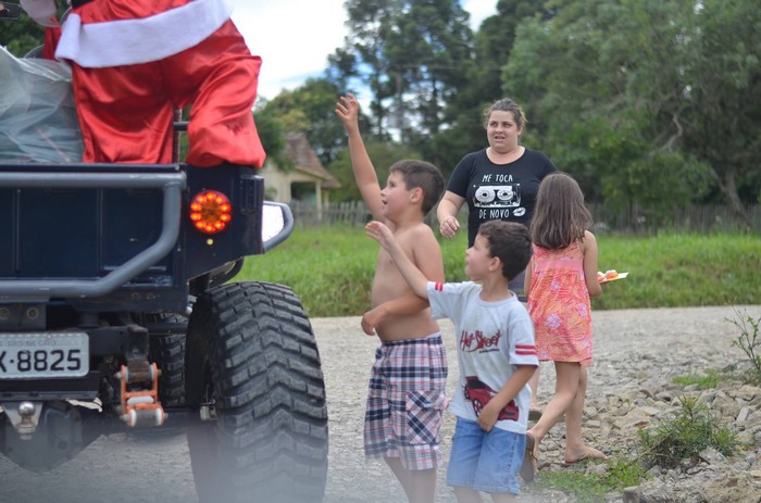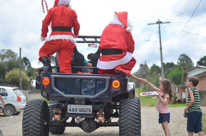 Geralmente o destino muda todo ano. Desta vez os bairros Vila Nova e Jardim do Moinho, em Mafra, receberam a visita dos jipeiros e do “bom velhinho”, que levaram muita alegria aos adultos e crianças por onde passaram.