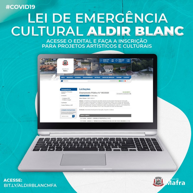 A Prefeitura de Mafra, por meio da Secretaria de Educação, Esporte e Cultura publicou nesta quinta-feira (12), o Edital de Chamamento Público nº 003/2020 com o intuito de selecionar artistas, trabalhadores e/ou fazedores de arte, cultura e entretenimento, para apresentações e produções culturais, em consonância com a Lei Federal nº 14.017 de 29 de junho de 2020 – Lei Aldir Blanc, que estabelece ações emergenciais para o setor cultural a serem adotadas durante o estado de calamidade pública decretada pelo Governo Federal em razão da pandemia do Covid-19.