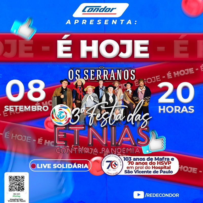 Com o tema “3ª Festa das Etnias contra a pandemia”, o Condor Supermercados apresenta uma live inteiramente solidária. Além do show, haverá a participação de representantes dos grupos étnicos, do hospital e do Condor. Durante a live está previsto um presente surpresa para Mafra. Fica aí uma grande expectativa para a população.