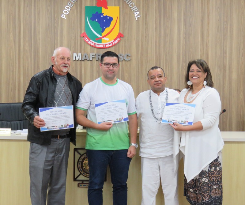 Ainda na sessão, a Câmara Municipal de Mafra, por meio do presidente Valdir Sokolski (PSB), a vereadora Claudia Bus (PTB) e Jefferson Luiz Grossl receberam um certificado de agradecimento do Instituto Carta Magna da Umbanda pelos relevantes serviços prestados.