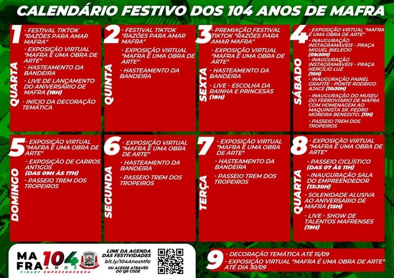 No site da Prefeitura de Mafra link MAFRA 104 ANOS e na AGENDA.