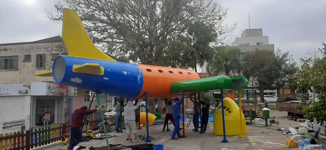 Com a instalação de brinquedos novos, as pracinhas de Mafra estão ficando cada vez mais atrativas e divertidas para que as crianças possam utilizar quando a pandemia passar. As praças Ferroviário Miguel Bielecki e Lauro Müller, no Centro de Mafra, têm uma atração a mais: o “avião parque” – um brinquedo composto por duas gangorras, dois balanços, um gira-gira, um trepa-trepa, uma escalada de madeira, quatro escadas, um balanço vai e vem, uma fuselagem e um mirante na asa esquerda.