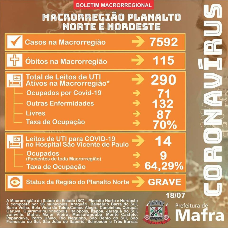 Mafra confirmou mais 20 casos de coronavÃrus neste sábado. Atualmente 49 pessoas estão recuperadas. Confira o boletim: