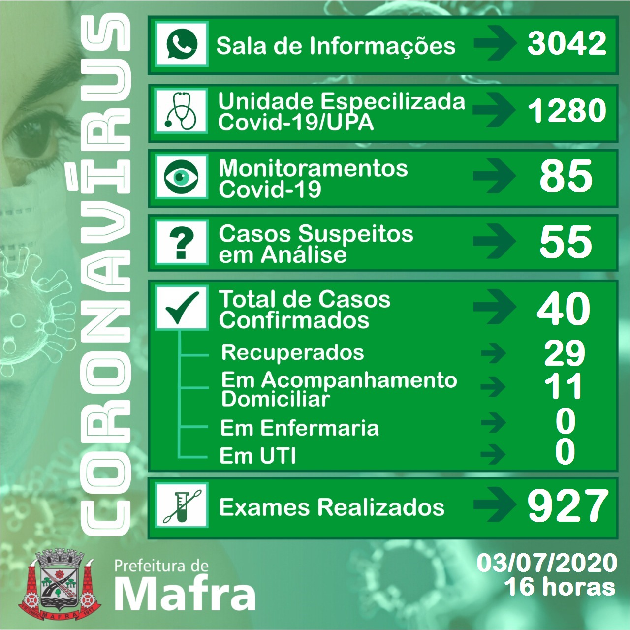 Dois novos casos de Covid-19 foram confirmados em Mafra nesta sexta-feira: paciente masculino com 36 anos de idade e uma feminina de 27 anos. Ambos estão em acompanhamento domiciliar.