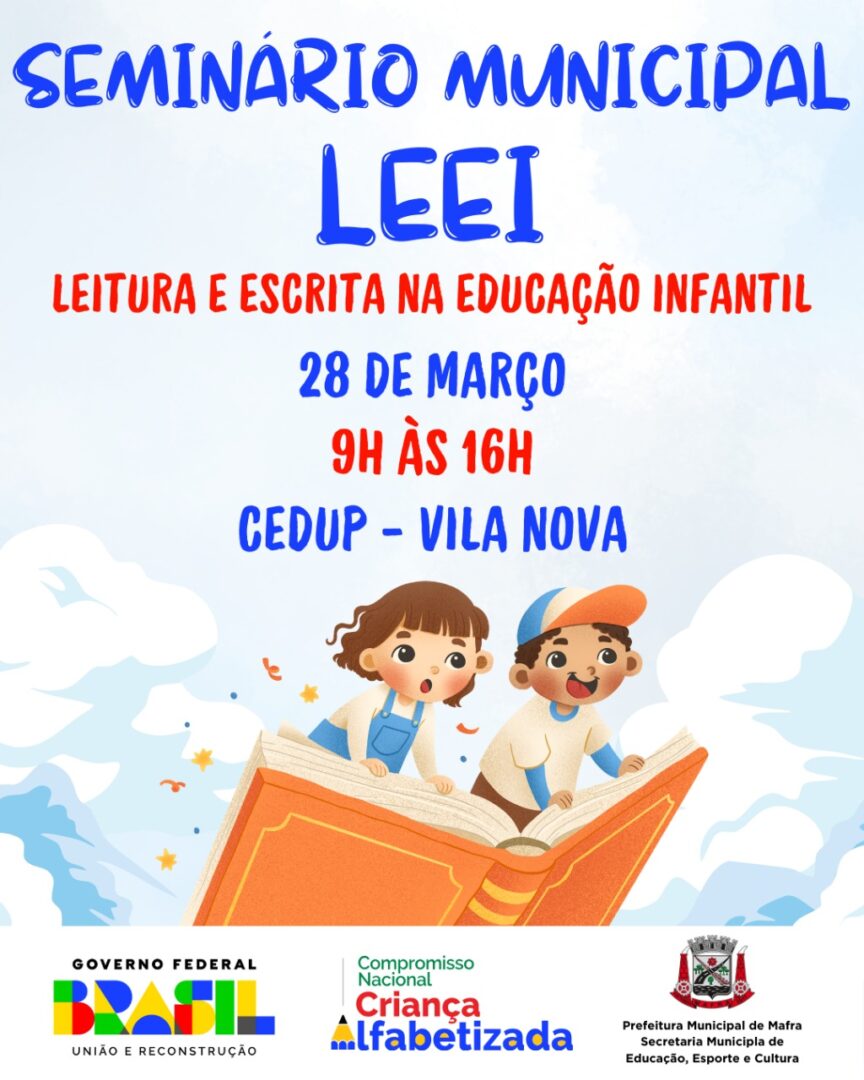 A Prefeitura de Mafra realizará no dia 28 de março, no CEDUP, o Seminário de Leitura e Escrita na Educação Infantil (LEEI), destinado aos professores e alunos da Educação Infantil. O evento será aberto à participação popular. O Seminário Municipal do LEEI, contará com Oficinas e apresentação de trabalhos realizados durante o curso. A abertura oficial será às 9 horas.