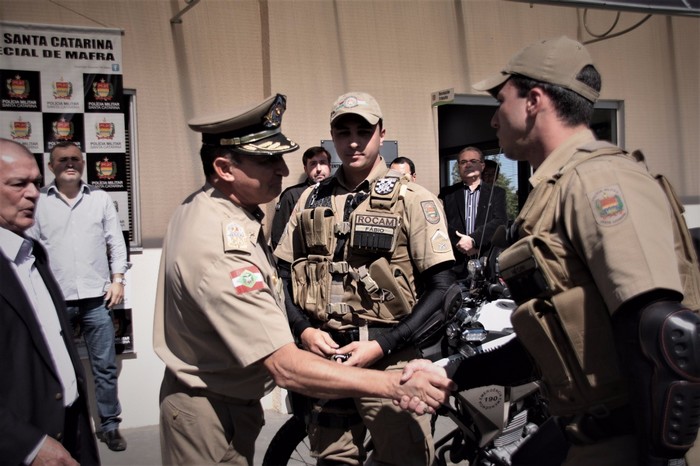 Na manhã deste sábado (29), o Cel. PM Paulo Henrique Hemm, Comandante Geral da Polícia Militar de Santa Catarina, esteve na Guarnição Especial de Mafra (GEMFA) para realizar pessoalmente a entrega de equipamentos para a equipe de Rondas Ostensivas com Apoio de Motos (ROCAM) e itens que compõe o kit de tecnologia embarcada – PMSC Mobile.