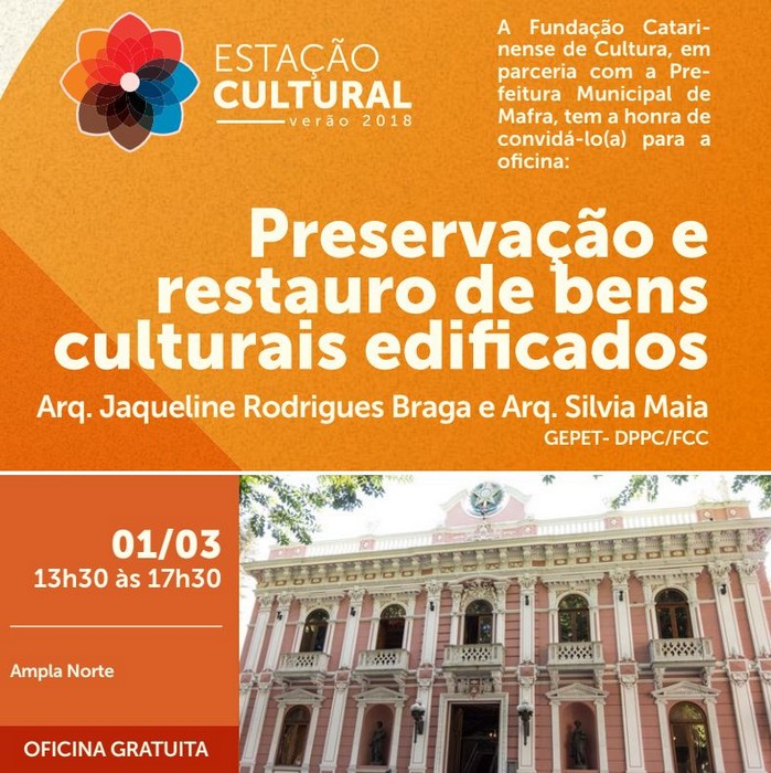 A programação em Mafra será amanhã 1º, das 13h30min às 17h na sede da Amplanorte com a oficina gratuita com tema: “Preservação e restauro de bens culturais edificados”, pelas arquitetas: Jaqueline Rodrigues Braga e Silvia Maia.