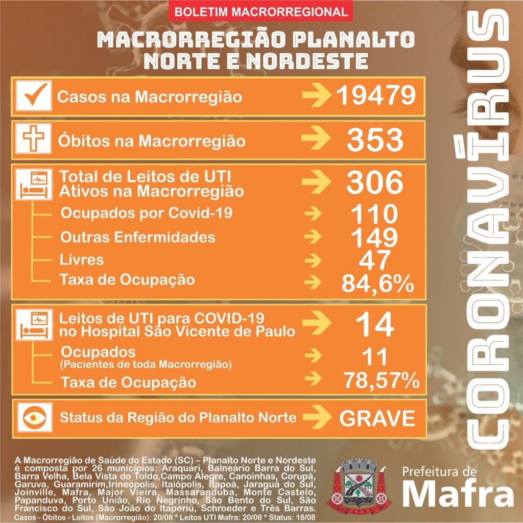 Nesta quinta-feira a cidade de Mafra registrou 13 novos casos de Covid-19. Confira os dados: