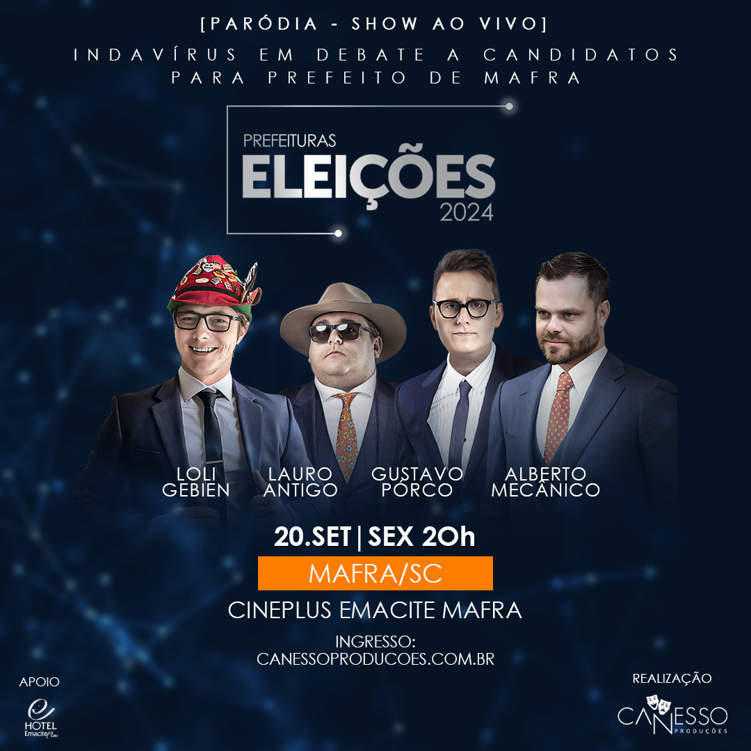 O evento será no dia 20/09 às 20h no Cineplus Emacite. Garanta o seu ingresso: https://canessoproducoes.com.br/produto/indavirus-em-debate-para-candidatos-a-prefeito-de-mafra-parodia-20-09-20h/