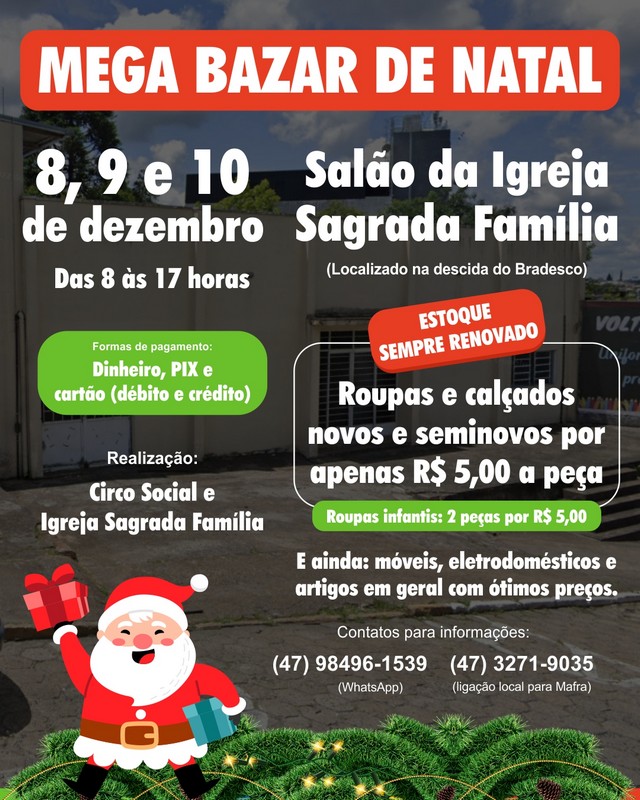 Está programado para os dias 08, 09 e 10 de dezembro, das 08 à s 17 horas, o Mega Bazar de Natal, a ser realizado no Salão da Igreja Sagrada FamÃlia, situado na descida do Bradesco em Mafra.