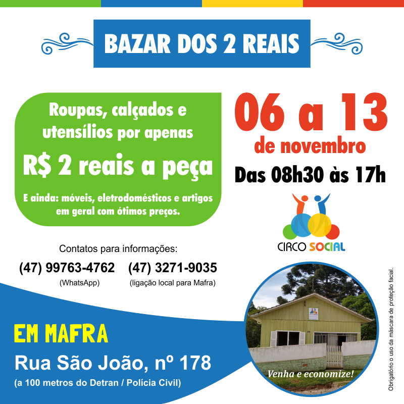 Compareça e economize! A renda do bazar será destinada à ação beneficente “Natal Encantado” do Projeto Circo Social, que tem a estimativa de atender aproximadamente 3.000 crianças de Riomafra durante o mês de dezembro.