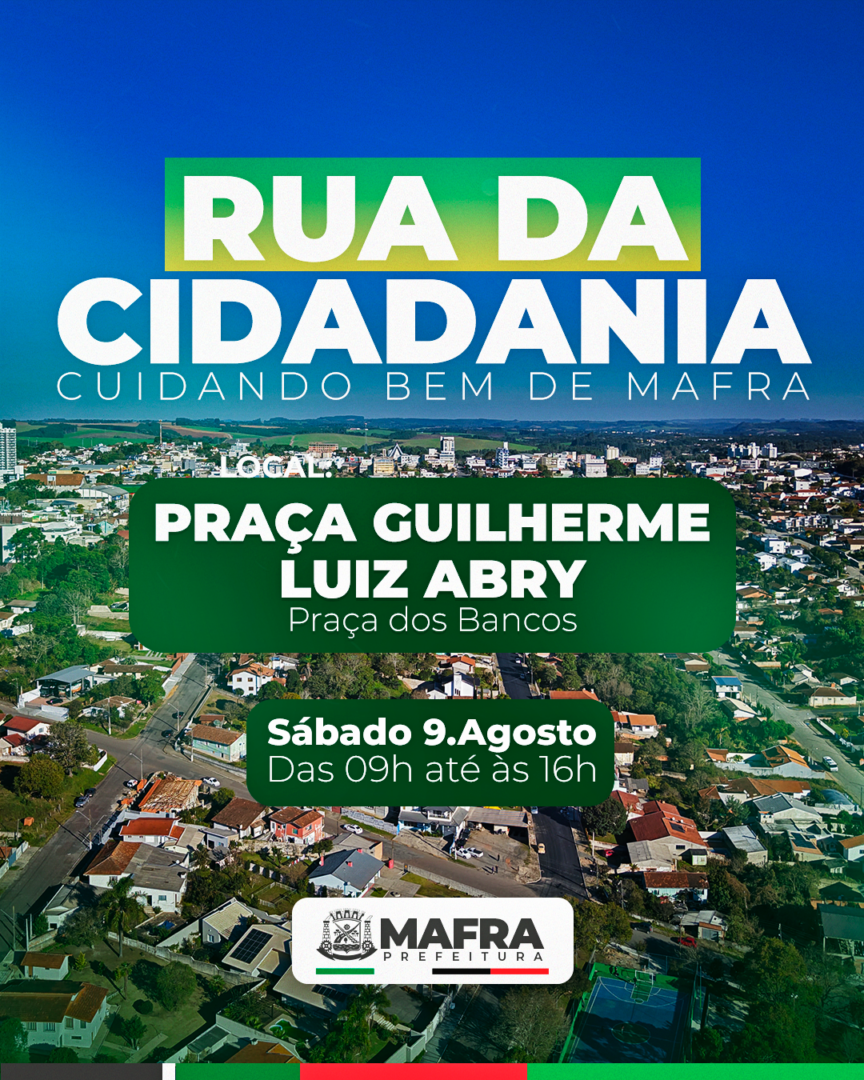 Sábado, dia 9 de agosto, terá a Rua da Cidadania em Mafra. Será na Praça Guilherme Luiz Abry (Praça dos Bancos), das 9 às 16 horas, com diversas ações gratuitas para a população mafrense.