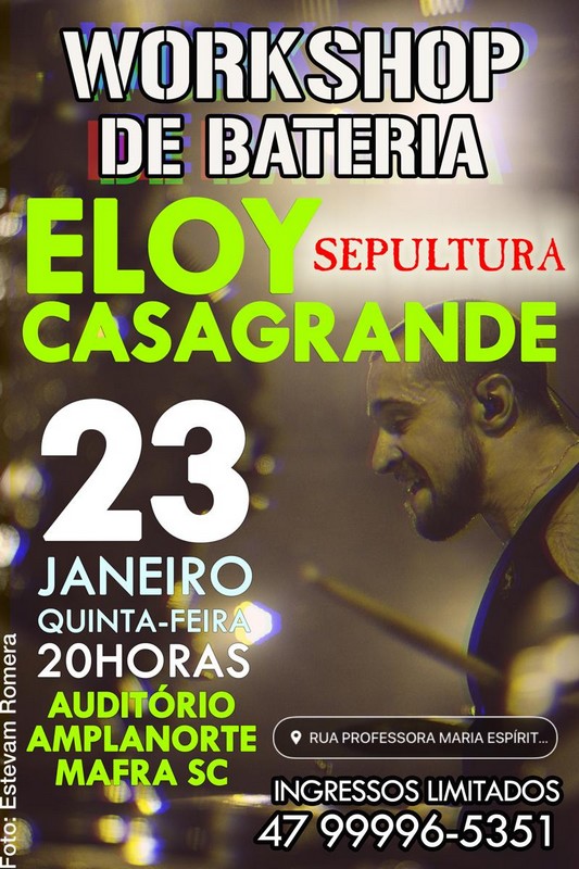 Mafra terá o Workshop de Bateria com Eloy Casagrande, baterista da banda Sepultura. O evento será realizado no próximo dia 23 (quinta-feira), às 20h no Auditório da Amplanorte. Os ingressos são limitados. Mais informações pelo contato: 47 99996-5351.