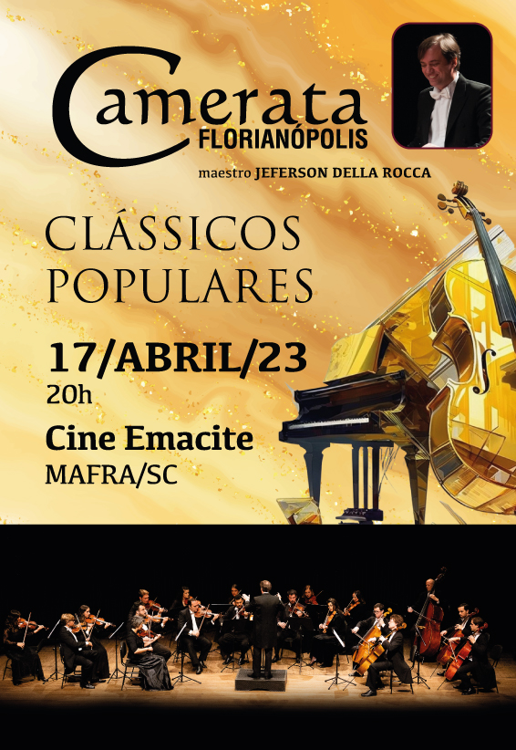 Na próxima segunda-feira, dia 17, à s 20 horas, no Cineplus Emacite, Mafra recebe a Camerata Florianópolis, que vai apresentar ao público clássicos populares, sob a regência de Jeferson Della Rocca – fundador, maestro e diretor artÃstico da Camerata Florianópolis – um dos mais atuantes músicos do Estado de Santa Catarina.
