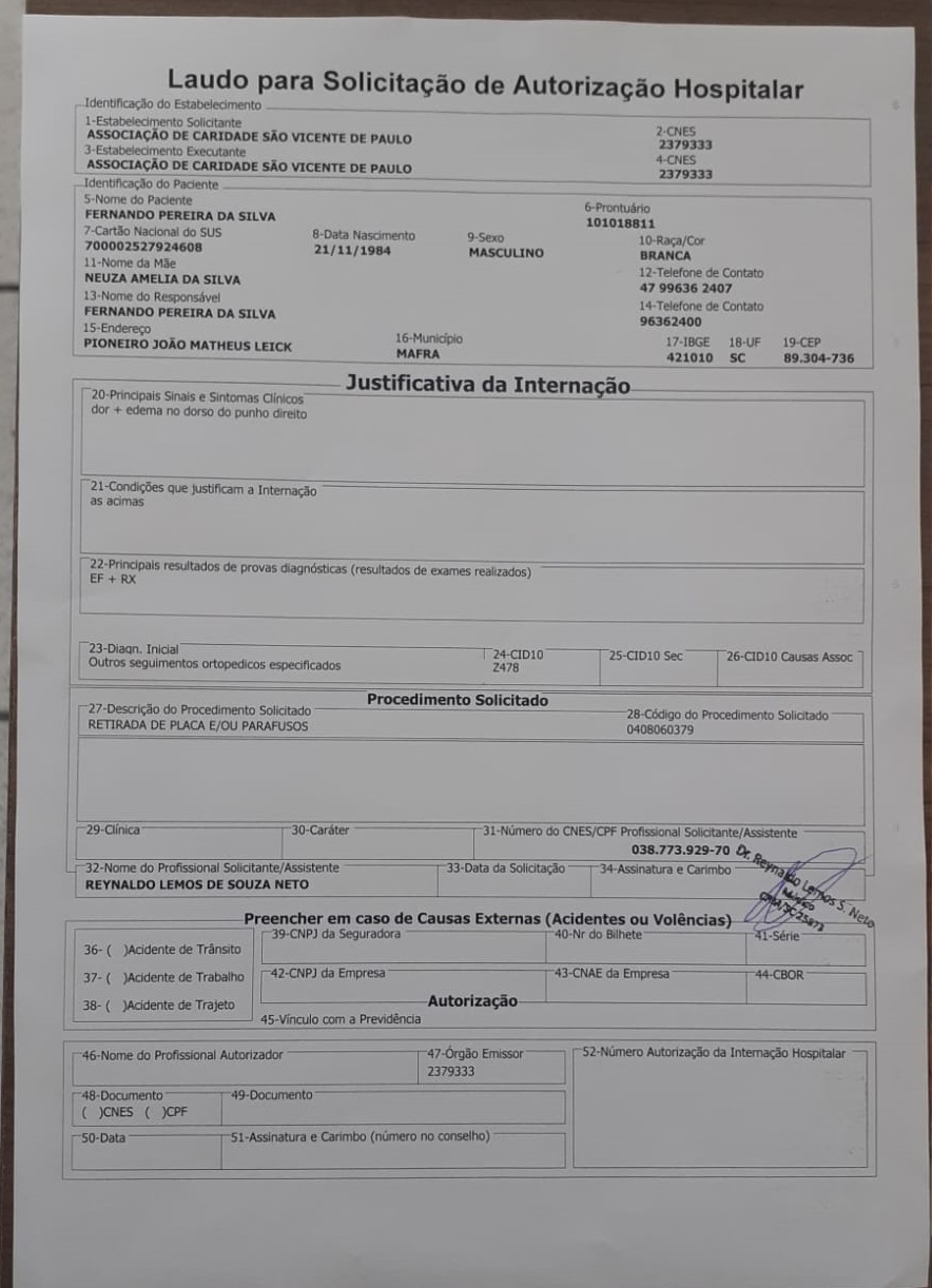 O mafrense Fernando Pereira da Silva precisa de ajuda para realizar uma importante cirurgia: Me chamo Fernando Pereira da Silva, tenho 38 anos sou morador da cidade de Mafra SC. A 2 anos fraturei meu braço (radio discal com extensão para metafise, fratura grave com cominuicao e perca óssea) passei por cirurgia onde foi colocado uma placa e 7 parafusos. Ao longo do tempo apareceu um cisto no carpo ( parte de cima da mao ) após vários exames foi constatado que 2 dos parafusos está transfixado no tendão, onde está causando infecção e atrofiando 3 dedos. Na última consulta foi feito uma solicitação cirúrgica para a retirada dos parafusos que estão causando a infecção e o atrofiamento dos dedos. A liberação da cirurgia pelo SUS demora em média 2 anos. Preciso realizar essa cirurgia o quanto antes para não perder o movimento dos dedos. Peço encarecidamente a ajuda para poder realizar a cirurgia. “A sua doação fará toda a diferença. Por favor, contribua com o que puder e ajude-nos a atingir nossa meta. Compartilhe esta vaquinha com seus amigos e familiares e junte-se a nós nesta causa importante. Juntos, podemos fazer a diferença!”