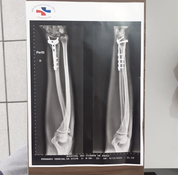 O mafrense Fernando Pereira da Silva precisa de ajuda para realizar uma importante cirurgia: Me chamo Fernando Pereira da Silva, tenho 38 anos sou morador da cidade de Mafra SC. A 2 anos fraturei meu braço (radio discal com extensão para metafise, fratura grave com cominuicao e perca óssea) passei por cirurgia onde foi colocado uma placa e 7 parafusos. Ao longo do tempo apareceu um cisto no carpo ( parte de cima da mao ) após vários exames foi constatado que 2 dos parafusos está transfixado no tendão, onde está causando infecção e atrofiando 3 dedos. Na última consulta foi feito uma solicitação cirúrgica para a retirada dos parafusos que estão causando a infecção e o atrofiamento dos dedos. A liberação da cirurgia pelo SUS demora em média 2 anos. Preciso realizar essa cirurgia o quanto antes para não perder o movimento dos dedos. Peço encarecidamente a ajuda para poder realizar a cirurgia. “A sua doação fará toda a diferença. Por favor, contribua com o que puder e ajude-nos a atingir nossa meta. Compartilhe esta vaquinha com seus amigos e familiares e junte-se a nós nesta causa importante. Juntos, podemos fazer a diferença!”
