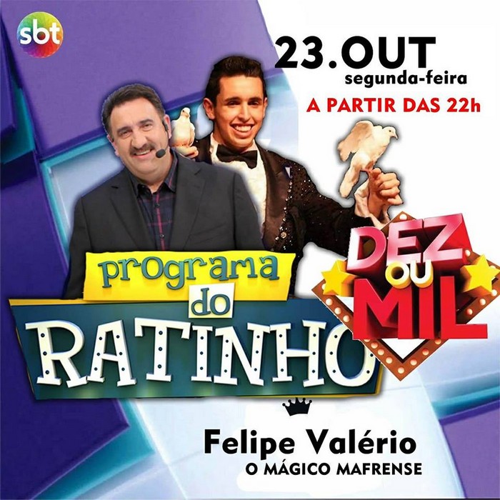 O talentoso mágico mafrense Felipe Valério participará ao vivo no quadro Dez ou Mil do Programa do Ratinho, no SBT, no próximo dia 23 (segunda-feira). O programa vai ao ar a partir das 22h.